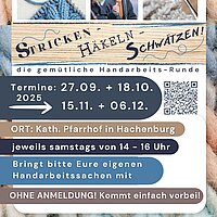 Einmal im Monat bieten wir die Möglichkeit, in gemütlicher Runde im Pfarrhof in Hachenburg mit Handarbeiten zusammenzusitzen, sich auszutauschen und "ein Schwätzchen" zu halten.