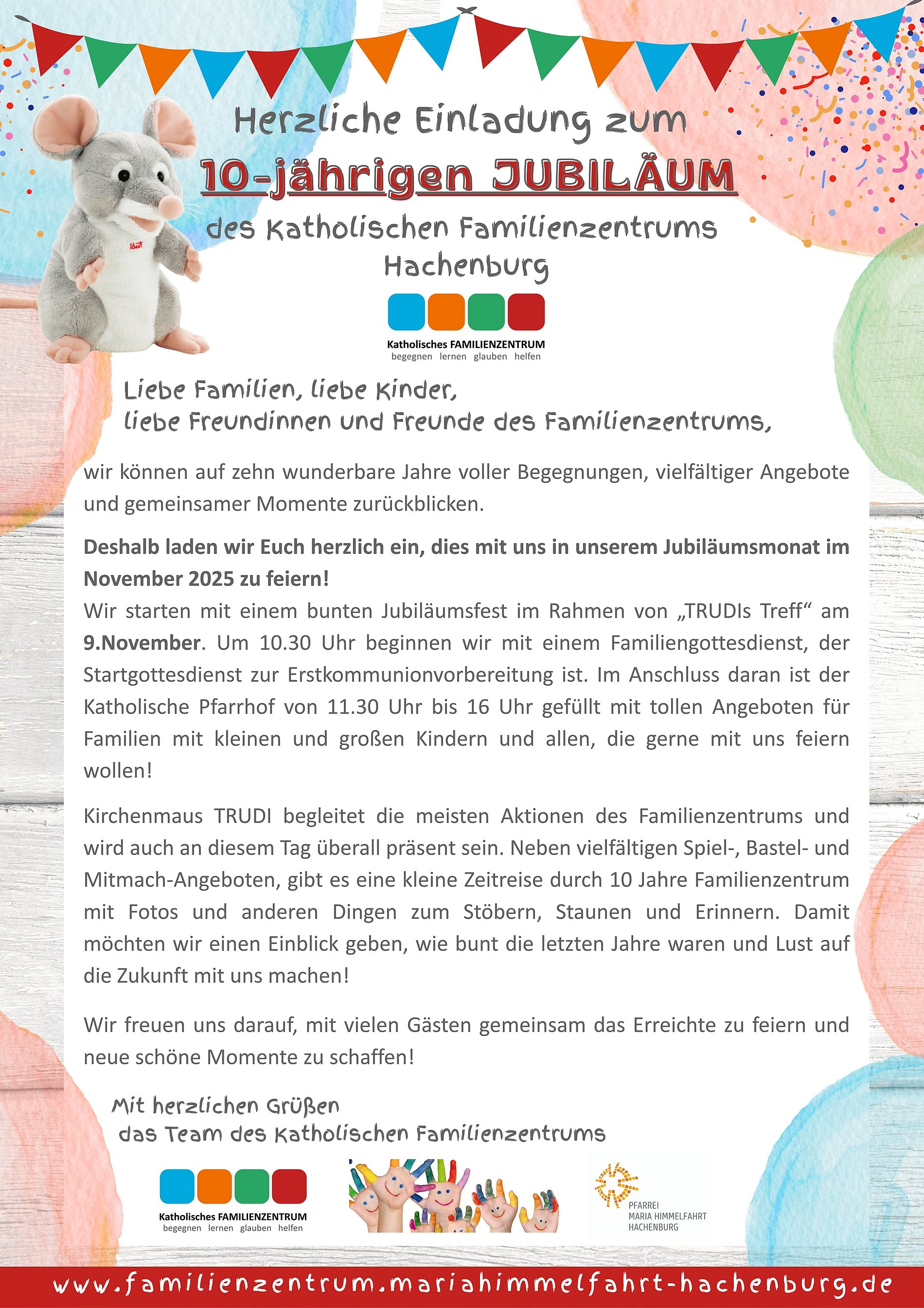 Wir haben mit einem bunten Jubiläumsfest im Rahmen von „TRUDIs Treff“ am 9.November gestartet. Um 10.30 Uhr haben wir mit einem Familiengottesdienst begonnen, der Startgottesdienst zur Erstkommunionvorbereitung war. Im Anschluss daran war der Katholische Pfarrhof von 11.30 Uhr bis 16 Uhr gefüllt mit tollen Angeboten für Familien mit kleinen und großen Kindern und allen, die gerne mit uns feiern wollten!