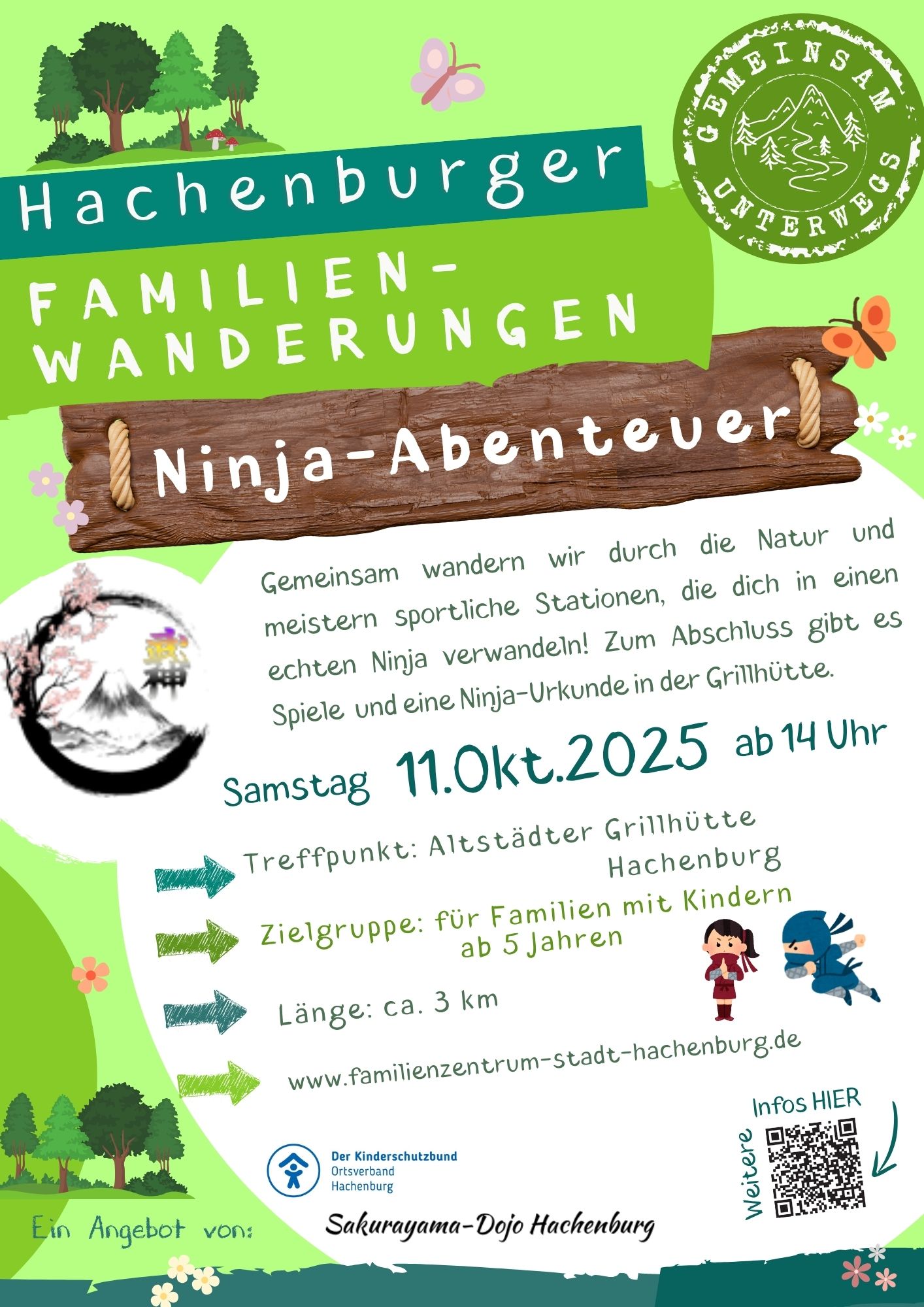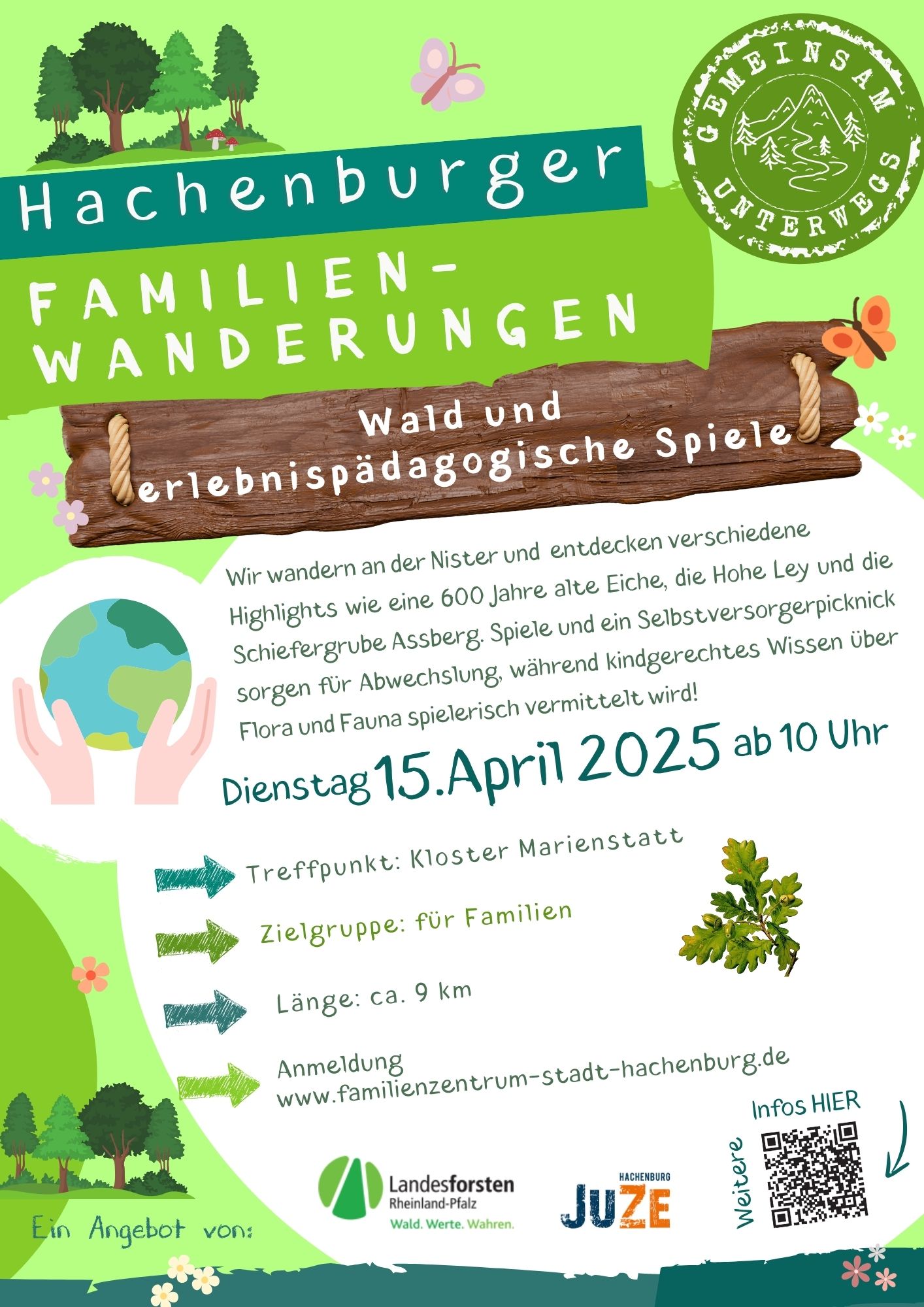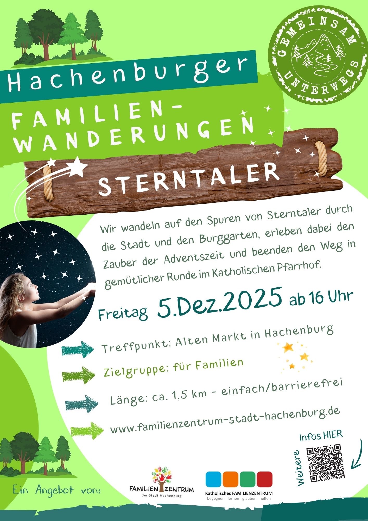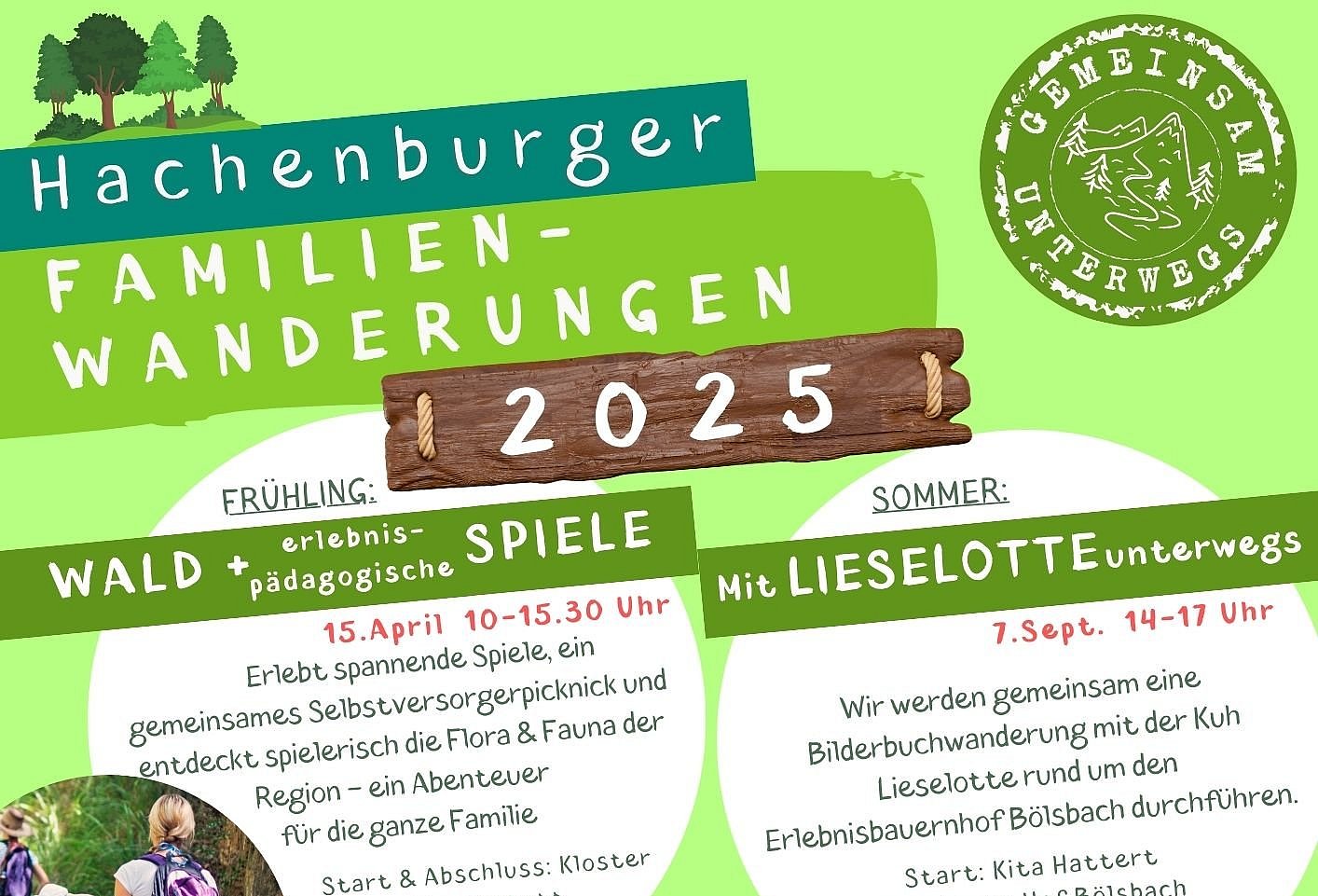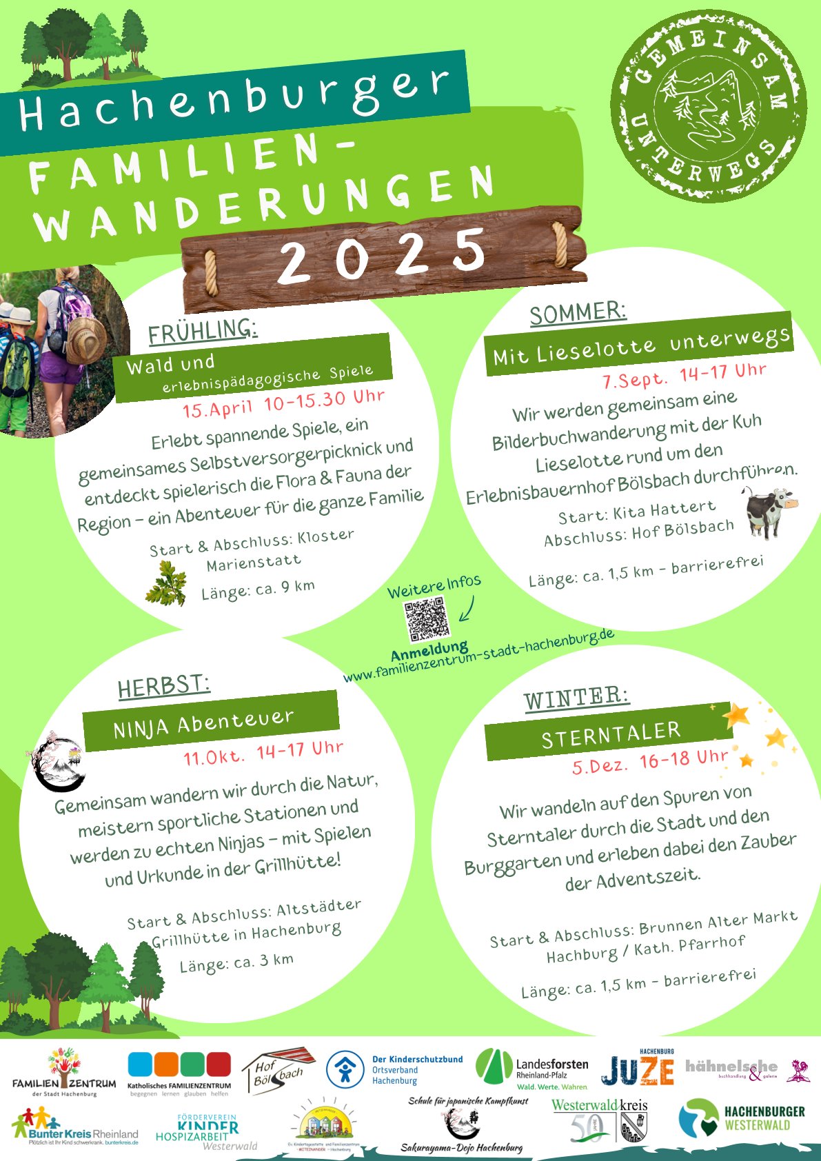 Von der spielerischen Vermittlung von Natur- und Nachhaltigkeitsthemen im Frühling über eine Bilderbuchwanderung mit der Kuh Lieselotte im Sommer bis hin zu einer actionreichen Ninja-Abenteuerwanderung im Herbst ist für jeden etwas dabei. Im Winter lädt die märchenhafte Wanderung „Sterntaler“ Familien dazu ein, gemeinsam Werte wie Zusammenhalt und Hilfsbereitschaft zu entdecken.