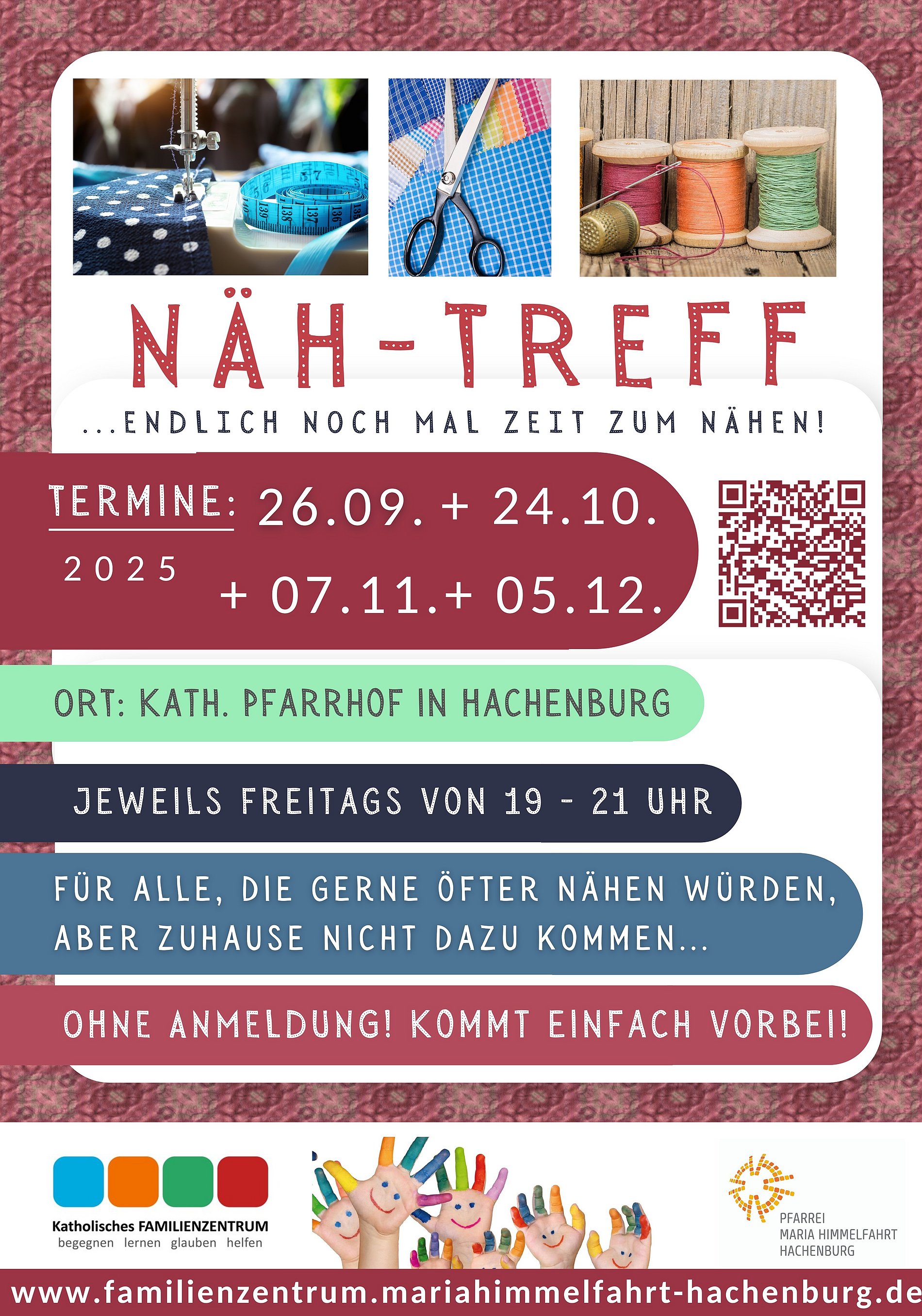 Hier bringt man einfach sein aktuelles Nähvorhaben und alles, was man dafür braucht, mit. Es gibt zwar keine Anleitung oder Vorschläge, aber bei Fragen oder Problemen kann man sich sicher gegenseitig helfen. Die Treffen finden jeweils freitags von 19 – 21 Uhr im Pfarrhof statt.