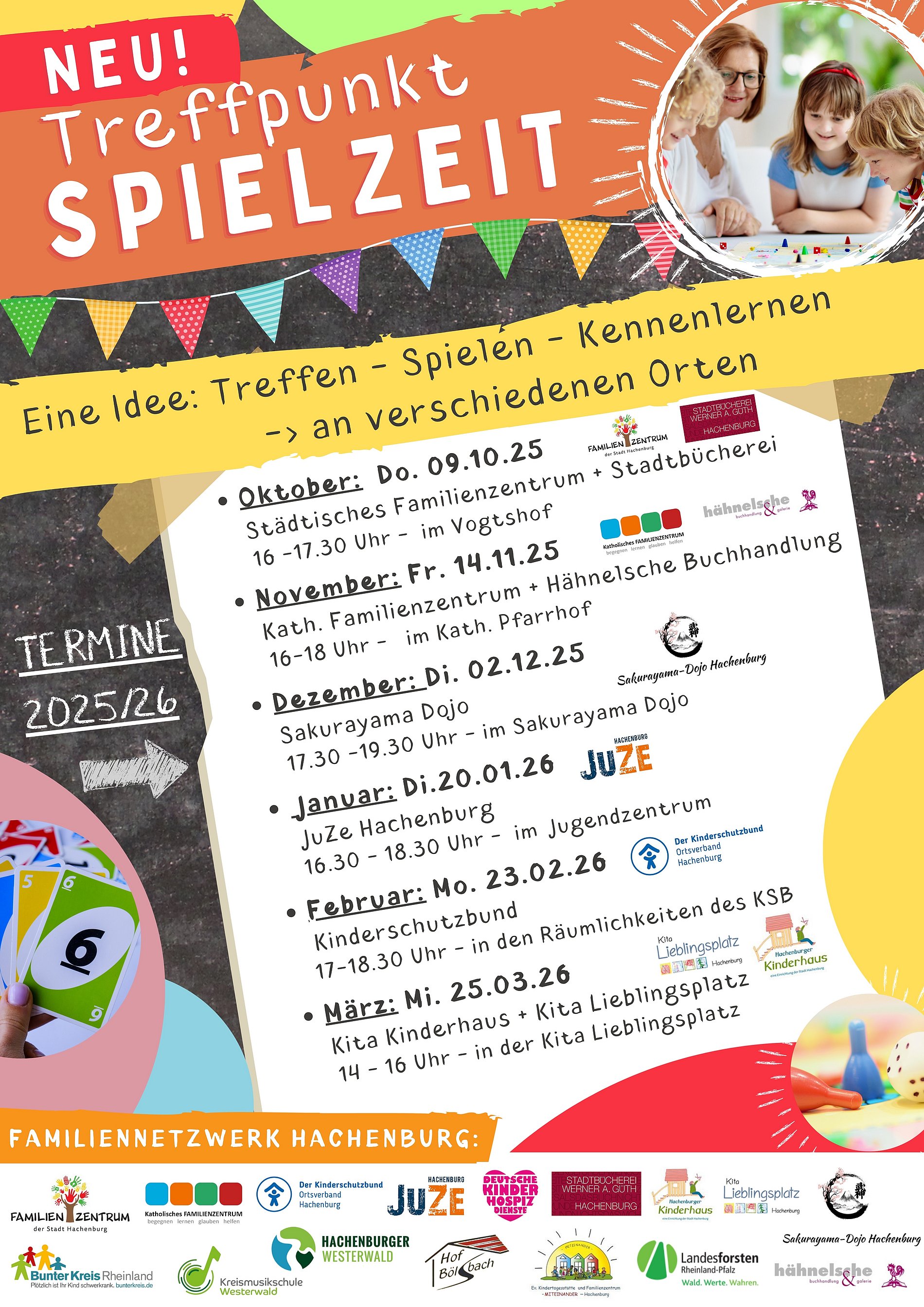 Das Familiennetzwerk Hachenburg, zu dem auch das Katholische Familienzentrum gehört, hat sich in den letzten Jahren mit vielen beliebten Aktionen – wie den Familienwanderungen oder dem Weltkindertag – einen Namen gemacht. Nun startet es mit den Spielnachmittagen „Treffpunkt SPIELZEIT“ für die ganze Familie ein weiteres Highlight, das von Oktober 2025 bis März 2026 Familien in und um Hachenburg zusammenbringt.
