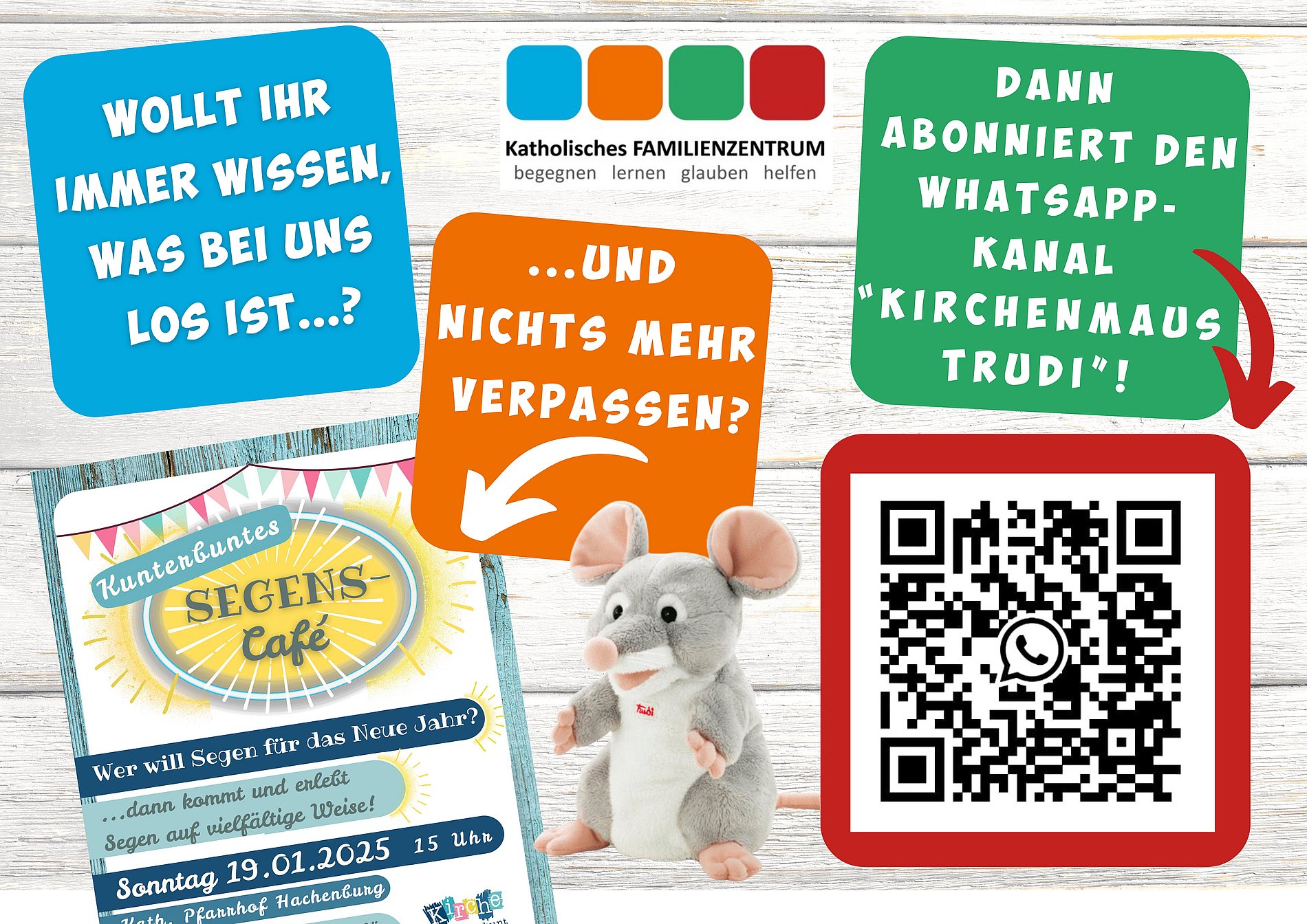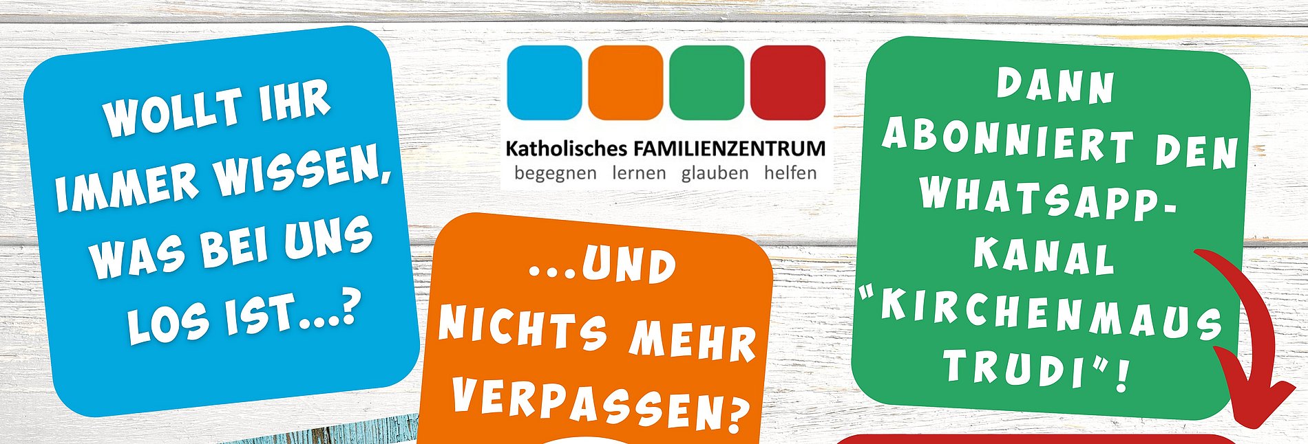 Wer immer über die Termine, Angebote und Neuigkeiten des Katholischen Familienzentrums unkompliziert und aktuell informiert sein möchte, kann den Whatsapp-Kanal „Kirchenmaus TRUDI“ abonnieren und verpasst nichts mehr.
