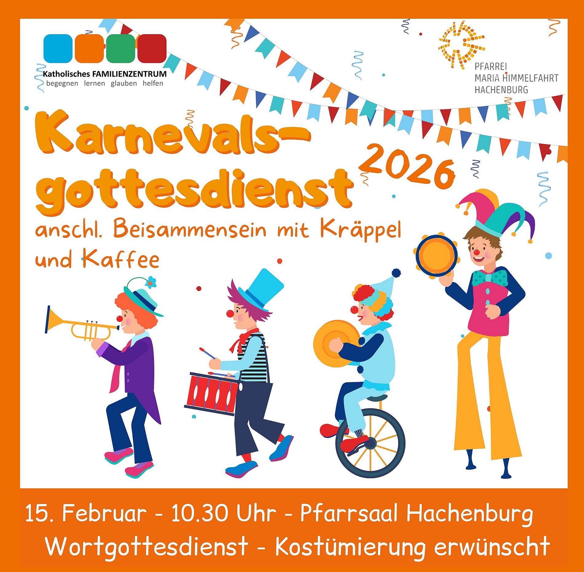 Am Sonntag, den 15.02. geht es im KARNEVALS-GOTTESDIENST im Pfarrhof in Hachenburg närrisch zu. Der Wortgottesdienst beginnt um 10.30 Uhr. Eine Kostümierung ist erwünscht und beim anschließenden Beisammensein gibt es Kräppel und Kaffee.