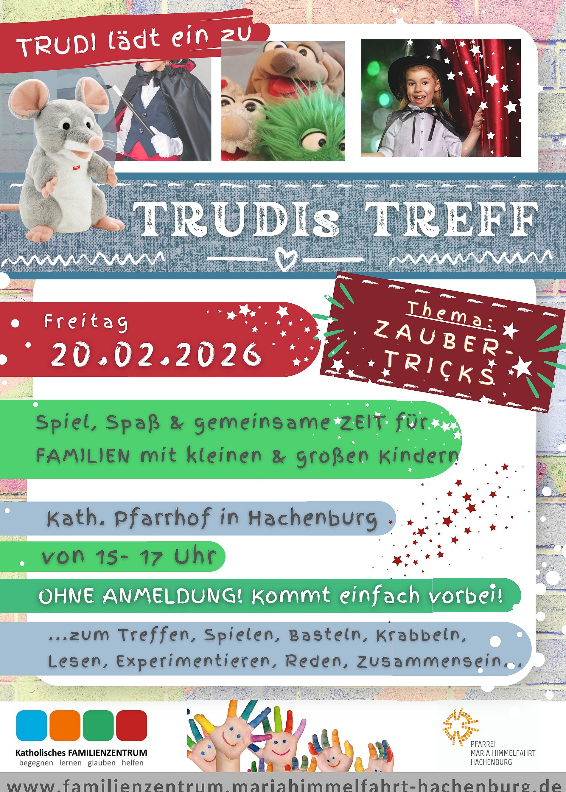Außerdem bietet sich bei TRUDIs TREFF wie immer die Gelegenheit sich zu treffen, sich kennenzulernen, sich bei einer Tasse Kaffee auszutauschen und gemeinsam eine schöne Zeit mit Spielen, Basteln oder in der Krabbel- und Lese-Ecke zu verbringen – als kleine gemeinsame AUSZEIT vom Alltag.